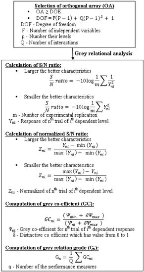- Ramamurthy, A.; Sivaramakrishnan, R.; Muthuramalingam, T. Taguchi-Grey computation methodology for optimum multiple performance measures on machining titanium alloy in WEDM process. Indian J. Eng. Mater. Sci. 2015, 22, 181–186. [Google Scholar]