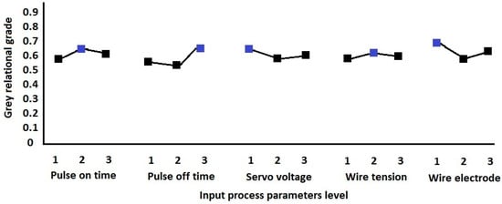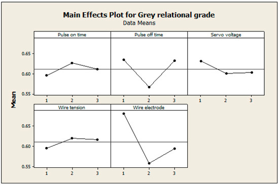 The main effect plot was used to examine the significance of the input factors on responses using Minitab software [16]. Figure 4 shows the effects of input factors on Grey relational grades. The surface measures of the machined specimens were considerably characterized by the wire wear ratio due to its significance in examining the discharge energy of every pulse cycle. The micro hardness and white layer thickness are characterized by the amount of resolidification of the workpiece and tool electrode. As the servo voltage contributes mostly to resolidification, it considerably influences the micro hardness and AWLT. The physical characteristics of the wire electrode influence the white layer thickness, as the recast layer consists of melted wire electrode material. The selection of the wire electrode has a vital role in determining the AWLT due to its weight in formulating the recast layer thickness. As the wire electrode has a considerable effect on determining the surface quality related parameters, it has a highly influential role in deciding surface measures in WEDM.