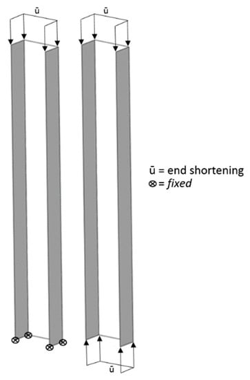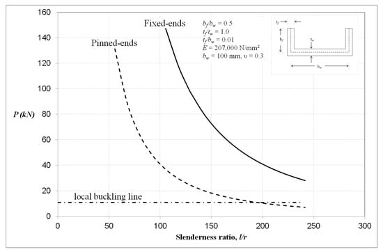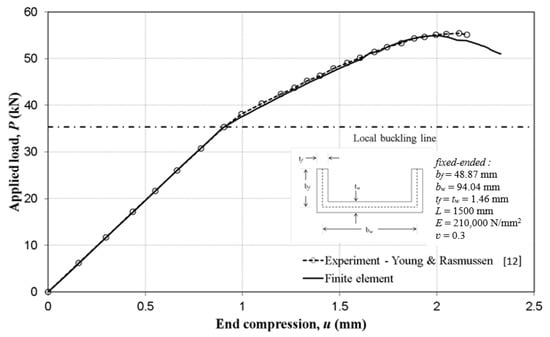 The plain channel-section of length 700 mm with corresponding slenderness ratio of 43 can be categorised as short column. The finite element analyses with regards to those being local rotationally constrained at the plate ends are shown in Figure 7. The cross-sectional details are as indicated in the figure and the material considered is steel with a yield stress levels of 250, 350 and 550 N/mm2, Young’s modulus E = 207,000 N/mm2 and Poisson’s ratio ν = 0.3. The analyses were performed using perfect structural geometries with elastic and elastic–perfectly plastic material models.