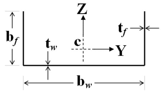 The cross-section geometrical details for the channel-section columns are shown in Figure 2. The Z- and Y-axes are located at the section centroid with the Z-axis being in the plane of geometrical symmetry of the cross-section. The Y-axis is parallel with the web edge of the section whilst the Z-axis is parallel with the edge of the flanges. The X-axis pointing out of the paper is the longitudinal axis along the member length. The sections have a length L; the width of the web and flanges are denoted by bw and bf, respectively; and both the web and flanges have the thickness of tw and tf, as indicated. It is to be noted that the cross-section dimensions bw and bf are the mid-surface dimensions.