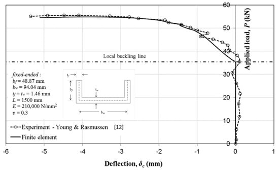 The behaviour of the fixed-ended plain channel column from the finite element simulation using the modelling strategies and solution procedures detailed in this paper was compared with the independent test work of Young and Rasmussen [12] and the comparison plots are shown in Figure 5 and Figure 6. The test column was 1500 mm long and the details of centreline dimensions of the section are as indicated in Figure 5. The actual stress–strain data reported by Young and Rasmussen [13] was used to represent the material model in the simulations, and the local geometric imperfection magnitude was in the order of wo = 0.01 mm. The column behaviour and the failure load from the simulation were seen to compare favourably with the test. The stable interaction was readily predicted and it is interesting to note that column deflection from the test began immediately after the local buckling load.