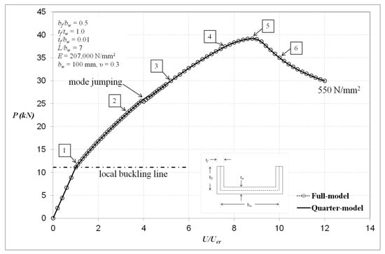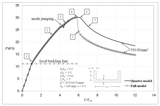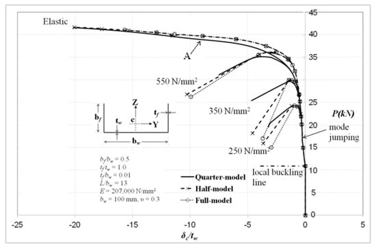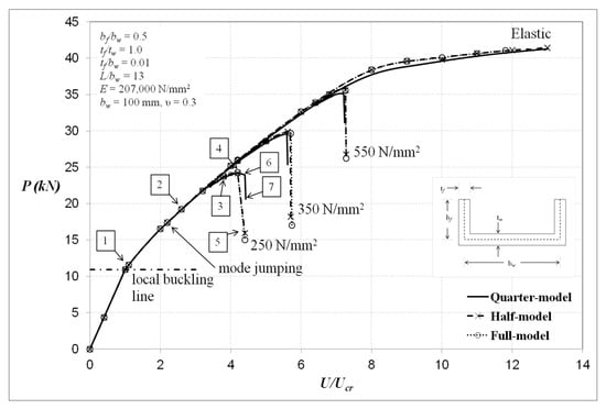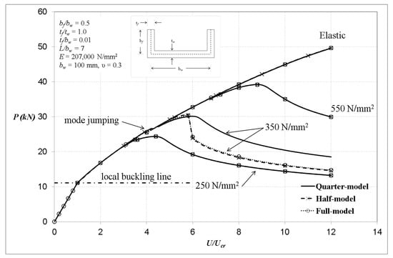 In Figure 7, generally, it is clear that the fixed-ended column has a substantially stable post-local elastic interactive response. The ultimate loads were reduced considerably when taking into account the influence of material plasticity. The elastic ultimate load was in the order of 70 kN but was reduced to about 39 kN, 30 kN and 24.5 kN corresponding to the yield stress levels of σY = 550, 350 and 250 N/mm2, respectively, in the elastoplastic solution. It is worth pointing out that, for the case where the channels are elastic, there is one point during the loading at which the numbers of local buckles change from five to seven for both cases of full- and quarter-models, and this is termed mode jumping, as indicated in Figure 7.