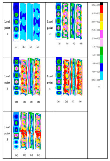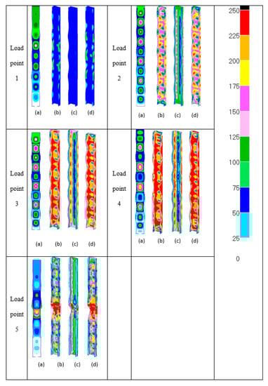 The growth of the deformed shapes and the von Mises stresses in relation to the end compression plot of Figure 13 using the quarter finite element model is shown in Figure 15. The von Mises stresses are everywhere elastic at load point locations 1 and 2, as indicated in Figure 15. At load level 2, the maximum stress is seen to be 244 N/mm2 on outer surfaces 1 and 2, which is close to the von Mises yielding at σY = 250 N/mm2. The first yielding is expected to occur between load levels 2 and 3, as indicated in Figure 15. It is noticed that, from the deformation images of load levels 1 and 2, the number of local buckles jumps from 9 to 11, and this mode jumping location is indicated in Figure 13. The additional local buckle is seen to be equally placed below and in the upper central region of the column. At load level 3, von Mises yielding occurs in the web and flange elements of the section on outer surfaces 1 and 2 and in the vicinity of the section junction along the length. It is clear from this that complete yielding through the wall thickness has been reached at different spots between the nodal planes and in the vicinity of the section junction. At load levels 4 and 5, the ultimate condition has been attained as a result of the full yield spreading on all the surfaces along the section junction near the column’s central region. At load level 5, it is clear that plastic mechanisms take place between the nodal planes of the central local buckle and in the proximity of the section junctions due to the fact that heavier local buckles are equally placed in the lower and upper region of the column.