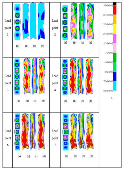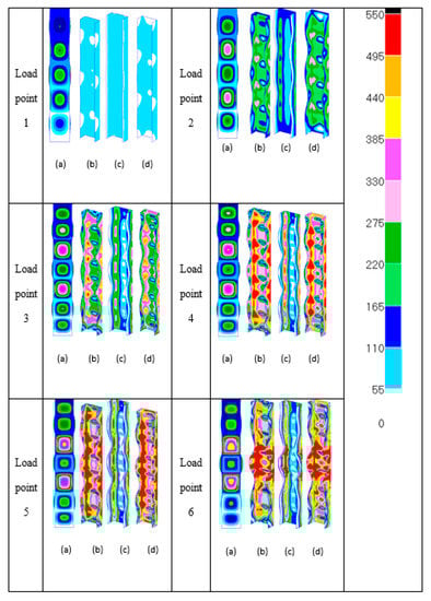 Deformation images (a) and growth of von Mises stresses with load ((b) outer surface 1; (c) middle surface; and (d) outer surface 2) of Figure 8 (full-model).