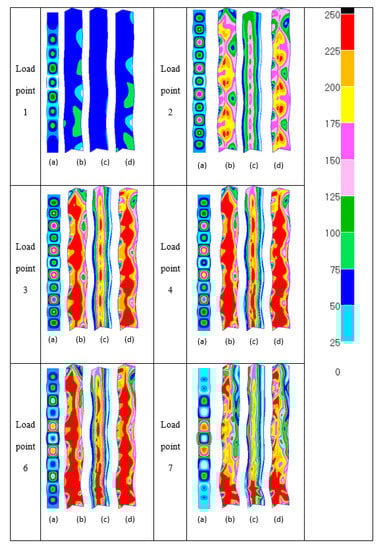 At load point locations 1 and 2, the von Mises stresses are everywhere less than the material yield stress level of σY = 250 N/mm2. At load level 2, the maximum stress is seen to be 240 N/mm2. For the section considered, the first yielding is found to occur between load levels 2 and 3, as indicated in Figure 14. It should be noted also that there is a local mode change along the column length at applied load level 2 whereby the number of local buckles changes from 9 to 10 and this mode jumping location is indicated in Figure 13. The additional local buckle is seen to be positioned below the central region of the column and also the central local buckle has been pushed upwards to make spaces for the additional local buckles. As a result, the region below the column mid-height has greater numbers of local buckles than the upper region. At load level 3, von Mises yielding occurs in the web and flange elements of the section on outer surfaces 1 and 2 and in the vicinity of the section junction along the length.