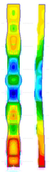Figure 16 shows the axial load and the column central deflection characteristics for the plain channel columns of Figure 13, whereby the global flexural mode is clearly evident. In the elastic range of behaviour, the local–overall deflected state of the column at location A is seen to have heavier local buckles in the central region in which the flange’s free edges are under the greatest compression, whereas the web element of the section is more heavily compressed in the outer region and the amplitude of the local buckles is seen to diminish towards the column ends, as depicted in Figure 17.