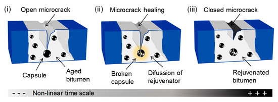Bituminous materials are viscoelastic composites mainly used for road and airport pavement construction. These materials include asphalt mixtures, mastics and bituminous binders [1]. Amongst the bituminous materials, asphalt mixtures are the most used for asphalt pavement construction in the world. When asphalt pavements are exposed to years of mechanical and thermal stresses, as well as environmental effects (i.e., air oxidation, ultraviolet (UV) radiation, moisture), debonding at the interface between bitumen and mineral aggregates can occur, resulting in their cracking [2]. Cracking of bituminous materials mainly occurs due to the oxidation of the hydrocarbon compounds of bitumen [3], which is a dark thermoplastic material composed of a solid part called asphaltenes and a liquid part called maltenes (resins and oils) [4]. During the oxidative process, additional oxygen-containing polar functional groups promote clustering mechanisms, the content of asphaltenes increases, while maltenes decrease, and all these molecular-scale changes result in an increase of rigidity of the pavement and, consequently, its damage by cracking [5]. Hence, different approaches and technologies to promote crack closure at an early stage have been recently proposed, based on the development of self-healing bituminous materials [6]. Numerous advances on novel self-healing bituminous materials for sustainable pavements have been developed over recent years, turning this topic into an emerging field of study. Currently, two different approaches have mainly been used to promote asphalt self-healing thereby extending the service life of asphalt pavements: first, an approach to reduce the viscosity of bitumen by increasing its temperature through externally triggered heating via induction and microwave radiation [7] and, secondly, an autonomic approach by the action of encapsulated rejuvenating agents [8]. Rejuvenating agents consist of lubricating and extender oils with a high proportion of maltene constituents, which restore the asphaltenes/maltenes ratio in the aged bitumen (i.e., reduce the stiffness of the aged binder) [9]. The concept of self-healing in bituminous materials over non-linear time is shown in Figure 1. When damage occurs in an asphalt containing embedded capsules, open microcracks appear and eventually propagate until they reach and break a capsule releasing the contained rejuvenating agent, which reduces the viscosity of aged bitumen by diffusion, allowing it to flow through the cracks, sealing them autonomously.