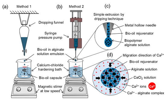 Preparation of the bio-based capsules containing bio-oil (BO). (a) Set-up of the dropping funnel method (M1); (b) set-up of the microfluidic pressure pump method (M2); (c) detail of BO encapsulation by simple extrusion through dripping technique using a syringe pressure pump, where the alginate emulsion is extruded through a metal hollow needle and added dropwise into a collecting/hardening bath where the biopolymer is cross-linked; (d) BO (BO) encapsulation in calcium alginate matrix via external gelation where Ca2+ ions migrate from the aqueous bath (CaCl2 solution) to the emulsion drop and, as a result, the alginate chains are progressively cross-linked forming irregular shaped or polynuclear BO capsules. (c,d) are based on Martins et al. [10].