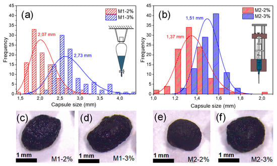 Furthermore, the distribution of the different BO capsule sizes is shown by the frequency histograms in Figure 5a,b, for capsules produced by method 1 and 2, respectively. This histogram proves that the BO capsule size can be fitted to the log-normal probability distribution (P-values 0.863 (M1–2%); 0.247 (M1–3%); 0.922 (M2–2%); and 0.676 (M2–3%) given by K-S test) used to model stochastic processes. Statistical size analysis of 100 individual BO capsules by each type registered an average size of 2.07 mm (SD = 0.32 mm), 2.73 mm (SD = 0.43 mm), 1.37 mm (SD = 0.14 mm) and 1.51 mm (SD = 0.10 mm) for capsules M1–2%, M1–3%, M2–2%, and M2–3%, respectively. These results proved that method 1 produced larger capsules than method 2 (51% and 82%, respectively) and that the increment of 1% of alginate (2% to 3%) increased the capsule size by 32% and 10% for methods 1 and 2, respectively. This result was due to the fact that the BO capsules produced by method 1 (Figure 5c,d) were more irregular compared with the capsules produced by the method 2 (Figure 5e,f).