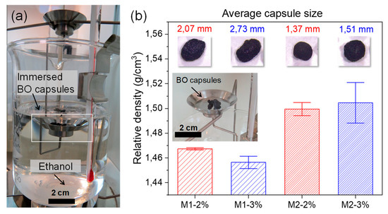 (a) Measurement of the relative density of the BO capsules with test method B of the ASTM D792-13 [22] used in the case of materials with densities that are very close to, or lighter than, water. In the image, the mass in air of a 100 mg sample BO of capsules was determined, and then it was immersed in ethanol with density 0.789 g/cm3, determining its apparent mass upon immersion and calculating its relative density; (b) average results of density of BO capsules with St. Dev. error bars.
