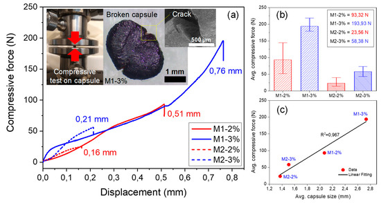 (a) Average curves of the compressive force versus displacement of the BO capsules tested following the recommendations of the ASTM D695-02a [24], including image details of the mechanical test, broken capsule, and crack type; (b) average results of maximum compressive force of capsules with St. Dev. error bars; (c) linear correlation between compressive force and capsule size.