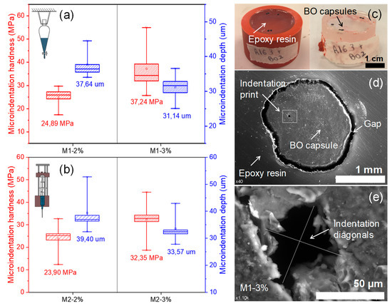 (a) Box plots of the results of Vickers micro-indentation hardness and depth for BO capsules produced by method 1; (b) box plots of the results of micro-indentation hardness and depth for BO capsules produced by method 2; (c) BO capsules embedded in a mould of epoxy resin; (d) SEM image of the BO capsule M1–3% taken 24 h after test; (e) SEM image detail of the micro-indentation print (i.e., indentation diagonals) in BO capsule M1–3% taken 24 h after test.