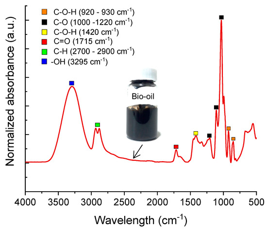 The BO sample was characterized by FTIR-ATR with the aim of identifying specific functional groups which could lead to an antioxidant activity of the BO and, as result, to a better performance as rejuvenating agent of aged asphalt binder. Figure 9 shows the normalized infrared spectra of BO obtained from the liquefaction process of corn stover residues. The assignment of spectral bands in the FTIR spectra was carried out based on that previously reported by Lievens et al. [25] and Stuart [26], regarding BO and oxygen-containing compounds. According to the results shown in Figure 9, the wavenumbers of substantial functional groups in BO are concentrated between 920 and 1720 cm−1, indicating the presence of species containing C–O–H, C–O and C=O bonds. These chemical species, usually acids, aldehydes, ketones and phenolics, derive from the deconstruction of cellulose and lignin during the liquefaction process, as has been widely reported [19]. Indeed, the absorption bands recorded between 1000 and 1220 cm−1 are associated with the C–O stretching in alcohols, glycols and phenolics. In particular, the lignin-derived phenolics have been identified as species with the potential to avoid the action of free radicals, thus with antioxidant properties [27].