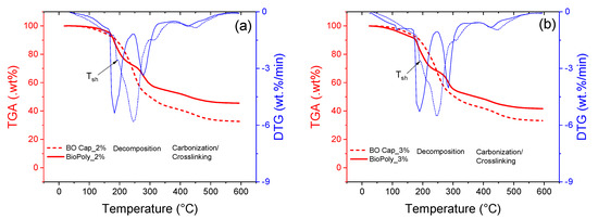 TGA and DTG results of the biopolymer matrix (BioPoly) and BO capsules (BO Cap) for concentrations of (a) 2% of alginate; and (b) 3% of alginate. Tsh is the DTG shoulder temperature.