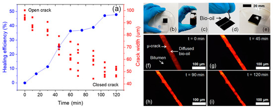 The self-healing capability of the BO as rejuvenating agent for asphalt was quantified in this study by means of fluorescence microscopy. Figure 11 presents the results of healing efficiency of BO as a proof of concept measured over time. From this Figure, it can be observed that BO obtained from the liquefaction of corn stover residues has the capability to close the µ-crack in the bitumen by effect of the diffusion of BO in bitumen. In Figure 11a, it can be seen that BO has a healing efficiency close to 50% at a time of 120 min of evaluation. Likewise, the µcrack-width showed a linear trend with the healing time. The healing process occurs because the bio-rejuvenator (i.e., BO) increases the content of viscous components of asphalts and decreases the viscosity of bitumen, allowing it to flow over time healing its open crack. In short, BO can dissolve the bitumen on both sides of the crack. Likewise, fluorescence images have allowed the measurement of the crack-closing over time because the diffusion of bituminous molecules caused by Brownian motion [30] was accelerated by the BO.