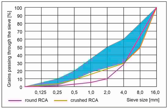 During research concrete with RCA containing metallurgical sludge waste, concrete with metallurgical sludge waste as a partial replacement of fine aggregate and the reference concrete were prepared. RCA was manufactured in two forms—rounded and crushed.