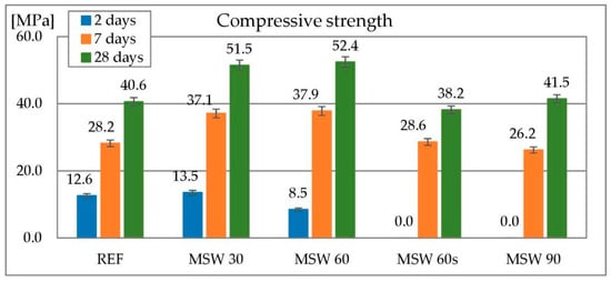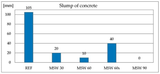 The consistency tests were conducted to determine the effect of the metallurgical sludge waste content on the plasticity of the concrete mix. It was suspected that due to the fineness of the material and its high water demand the consistency would deteriorate. The reference mixture showed a slump of 105 mm, which qualifies it to consistency class S3 according to EN 206-1. Results of consistency tests are presented in Figure 7. Concrete containing metallurgical sludge waste as 30% sand replacement reached 20 mm slump and the one containing 60% of metallurgical sludge waste as a sand replacement 10 mm. An attempt was made to improve the consistency of the latter with a superplasticizer. After the addition of a 1.55% admixture by cement’s mass, the slump reached 40 mm. As a result, these three mixes reached the S1 consistency class. The concrete mix containing metallurgical sludge waste as a 90% sand replacement did not show a slump even after adding a superplasticizer in amount of 2% of cement mass, which is the maximum dosage recommended by the manufacturer. It cannot be classified in any of the consistency classes. Deterioration of consistency is related to the high water demand of metallurgical sludge waste and its high granularity. However, with the help of superplasticizers it is possible to freely shape the consistency of a mixture containing large amounts of metallurgical sludge waste in such a way that it can be applied to the civil engineering purposes. The effect of consistency loss of the concrete mix containing metallurgical sludge waste can be compared to the use of other dusts and powders. One example is the granite dusts described in [75], which greatly increase the amount of water required to make the concrete mix workable. Similar observations are described for concretes containing glass powder [76], marble powder [77,78], quartz powder, dolomitic powder and other stone dusts [79] and sewage sludge waste [80]. Studies described by other researchers confirm that it is possible to shape the consistency of a dust-containing mixes freely with the superplasticizers [75].