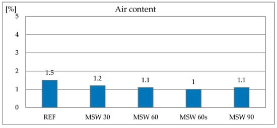 The measurement of air content in the concrete mix was to determine whether the concrete mixes, despite their deteriorated consistency, are capable of adequate compaction and deaeration after application of vibrations. The reference mix had 1.5% air content. All mixes containing metallurgical sludge waste showed a lower air content (1.0%–1.5%) in comparison to the reference mix. However, this is not a significant difference and can be related to the vibration time and accuracy of the test method. The results of the air content in concrete mixes tests are shown in Figure 8. It was proved that it is possible to properly compact and deaerate mixes containing metallurgical sludge waste, of course after applying a superplasticizer to improve consistency.