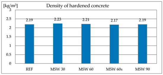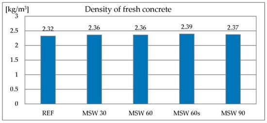 The density of the concrete mixture is related to its air content. The reference mixture had a density of 2.32 kg/dm3. All mixes containing metallurgical sludge waste showed a slightly higher density (2.36–2.39 kg/dm3). This is caused by a higher degree of structure tightness by introducing a very fine material. The degree of compactness can be significantly higher due to the large difference in density between metallurgical sludge waste and sand, which is significantly lower for the former material. The results of the concrete mix density test are shown in Figure 9.