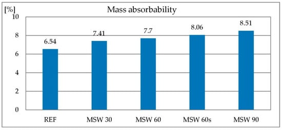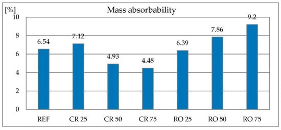 The use of RCA as a replacement for natural aggregate results in increased concrete absorbability. The absorbability increases from about 5.5% for concrete without RCA to about 8% at 100% replacement level. Increase of absorbability and porosity by 15%–38% and decrease of density by 4%–7% for HPC is described in [26]. Studies described in [25] showed that concretes containing 50 and 100% RCA have a lower density compared to control concrete. The density of concrete containing 100% RCA is lower than the reference concrete by 5%–6% and its absorbability higher by about 70% [29].