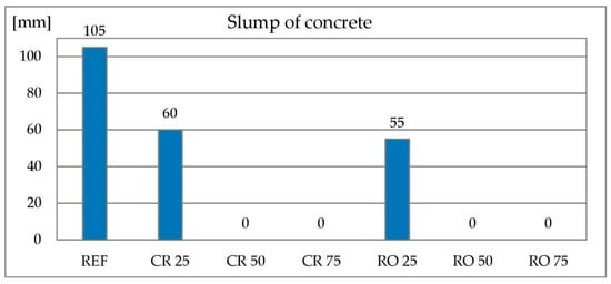 The use of RCA increases the demand for water and decreases the consistency of the concrete mix with the same effective water-cement ratio. This applies to mixtures containing 50% and 100% RCA [23]. Similar results are presented in [24]. The studies described in [25] have shown that mixes containing 50% and 100% RCA and modified with a superplasticizer have reached the same consistency as the reference mix-therefore it is possible to control the consistency of mixes containing even large amounts of RCA.
