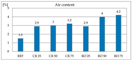 No effect of the substitution of 50% and 100% RCA on the air content of the concrete mix was found [23]. The studies described in [25] showed that mixes containing 50% and 100% RCA show a slightly increased air content.