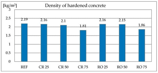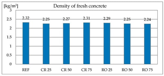 The full replacement of the natural aggregate with RCA results in a lower concrete mix density [23]. The density of High Performance Concrete (HPC) containing RCA is lower compared to the control mix [26]. The tests described in [25] showed that mixtures containing 50% and 100% RCA have lower density in comparison with the control mixture.