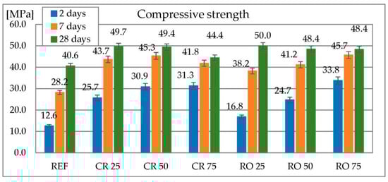 The use of RCA may result in deterioration of the mechanical properties of concrete—this depends on the quality of the concrete used. It is stated that the use of 30% RCA as a substitute for natural aggregate has not resulted in a decrease in compressive strength [27]. Increasing the amount of RCA to 100% reduced strength by about 10%. The strength of concrete containing 100% RCA is lower by about 8% after 2 days but higher by about 5% after 7 and 28 days [23]. After 28 days a decrease in compressive strength by about 10% was found [24]. Similar relationships were found for mortars containing 25%–100% fine RCA [28]. Reduction of compressive and flexural strength and elasticity modulus was also described for HPC containing RCA after 7, 14 and 28 days [26]. Concretes containing 50% and 100% RCA have lower compressive strength compared to control concrete, however, the use of concrete from railway sleepers demolition caused an increase in strength [25]. The compressive strength of concrete containing RCA is 30% less than the reference concrete, and the compressive strength is 10% less. Static and dynamic modulus of elasticity decreased by about 20% [29]. Similar results were obtained by other researchers [30].
