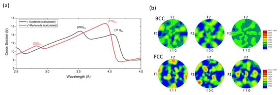Figure 2a shows the calculated attenuation spectra for 100% γ-austenite and 100% α’-martensite. These spectra have been calculated accounting for (1) the alloying elements of SS304, (2) the effect of crystallographic texture, using the pole figures (Figure 2b measured at the center of the sample with electron backscatter diffraction (EBSD) and applying the correction in [,], (3) the second order diffraction that affects the selection of wavelengths from the DCM, and (4) its wavelength resolution dλ/λ = 0.05 Å (FWHM). The measured spectra were then least-square fitted using a linear combination of the calculated spectra of γ-austenite and α’-martensite (Figure 3).