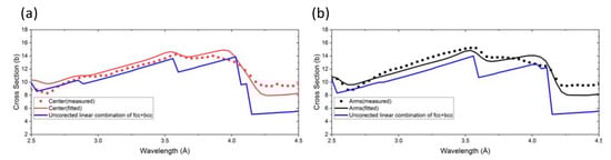 Measured (points), refined uncorrected (blue), and refined corrected (red or black lines) Bragg edge curves for two locations, (a) center of the cruciform with 60% γ-austenite (fcc) and 40% α’-martensite (bcc), and (b) arms of the cruciform with 91% γ-austenite (fcc) and 9% α’-martensite (bcc).