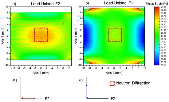 The material was deformed using the biaxial deformation rig of the POLDI beamline at the Swiss spallation neutron source, SINQ []. The cruciform sample was initially deformed along the rolling direction (direction F2) in load control, with a loading rate of 80 N/s up to a maximum force of 50 kN. The sample was then unloaded to 0 N, followed by deformation along the F1 direction with a loading rate of 80 N/s, up to a maximum force of 60 kN. The neutron diffraction measurements were carried out in predefined force intervals after interrupting the loading and holding the displacement (see Figure 1b) using a gauge volume of 3.8 × 3.8 × 2 mm3 gauge volume. The biaxial deformation system is equipped with a 2-camera digital image correlation (DIC) system (GOM Aramis 5M, GOM GmbH, Braunschweig, Germany) for measuring the in-plane strain at the center of the cruciform sample. The DIC strain was averaged over an area of 3.8 × 3.8 mm2, which corresponds to the area illuminated by the neutron beam during the neutron diffraction experiments. During holding the displacement, force/stress relaxation is recorded due to creep, as seen in the characteristic dips in Figure 1b. The maximum equivalent strain reached at the center of the cruciform during each of the load paths is approximately 41% and 26%, respectively. The accumulated Von Mises strain for both load paths is, hence, approximately 67%.