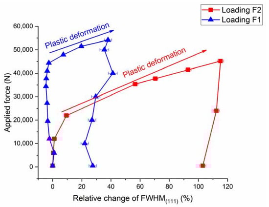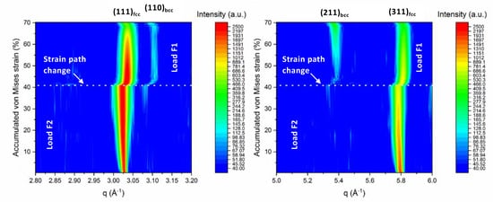 As mentioned in the introduction, the TRIP effect is suppressed under uniaxial loading for SS304, as seen in Figure 5, where the neutron diffraction pattern does not exhibit pronounced α’-martensite peaks upon the first load path, i.e., loading along F2. A weak martensite reflection appears at strain >35% during the first loading path. As a result of the suppressed TRIP effect under uniaxial loading (loading F2), the deformation is dominated by dislocation slip which is seen as pronounced peak broadening due to an increase of the density of dislocations and slip in Figure 6. In contrast, upon changing the load path (i.e., loading F1), the deformation is dominated by the martensitic phase transformation, as shown in Figure 5, where strong martensite reflections appear in the neutron diffraction pattern. In contrast to the first load path, the increase of FWHM is not as pronounced during the second load path, as shown in Figure 6. It should be noted that the transformation and dislocations activity is dependent on the crystallographic orientation, with respect to the loading direction [,,,]. In Figure 6, the normal to the {111} planes is parallel to the loading direction, F2, and the neutron scattering vector, q. The <111>-oriented grains can be divided into sub-sets of grains according to their crystallographic alignment with respect to second loading axis (loading along F1). Therefore, the observed broadening of the (111) reflection can be affected by the alignment of each grain with respect to the loading direction F2.