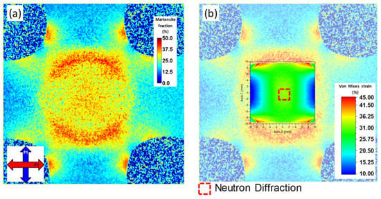 Neutron diffraction contrast imaging is capable of capturing very well the spatial distribution of martensite induced due to stress concentrations, as presented in Figure 8. A FE simulation was carried out using the commercial ABAQUS/Standard software, (Version 6.14, Dassault Systèmes, Providence, RI, USA). The stress-strain curve and isotropic elastic properties of SS304 obtained from uniaxial loading of a dogbone sample are used as materials properties input to the built-in model based on the Von Mises yield criterion and the associated flow rule. In order to improve the computational efficiency, only 1/8th of the entire cruciform geometry was simulated with symmetric boundary conditions being applied on the appropriate surfaces. A structured hexahedron mesh was used with linear 8-node C3D8. The simulation was undertaken with a linear loading (surface traction mode) to a target force of 50 kN along only one direction. The subsequent loading was not simulated due to lack of mechanical properties of the material with prior deformation. Nevertheless, neutron diffraction contrast imaging captures well the locations that FE modeling predicts strain localization under uniaxial loading. Moreover, this method opens new potentials for spatially-resolved simulations and applications of kinetic models. By combining 2-dimensional maps of strain-induced martensite fractions, obtained from diffraction contrast imaging, with the stress state variations obtained from FE simulations and the equivalent strain magnitudes obtained from DIC, it is possible to apply kinetic models that can describe the martensite phase fraction as a function of strain magnitude [,,] and/or stress state [,,]. Applications where diffraction contrast imaging for phase/strain analysis has already been undertaken are torsion tests [], bending tests where the strain (and in association to strain the strain-induced martensite) varies from tensile, through a neutral line to compression [], and complex stress states in fatigue samples. Potential new applications could include bulge tests that the strain and stress states vary significantly from place to place [], deformation tests on metallic foams [,], and additively manufactured open cell structures [,,] that exhibit local complex stress states and strain concentrations.