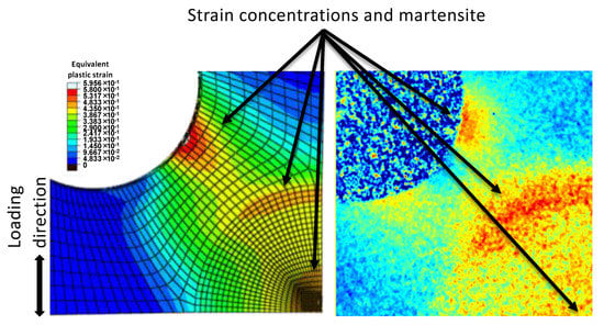 Figure 7a shows the diffraction contrast imaging phase map, which clearly depicts deformation-induced martensite concentrations. It is seen that martensite preferentially forms at locations where stresses typically concentrate during deformation of cruciform samples. Moreover, the center of the cruciform sample, which is mapped with neutron diffraction, exhibits a relatively uniform distribution of martensite with an average fraction of approximately 40%, which agrees very well with the averaged martensite fraction of approximately 41% obtained by EBSD. Interestingly, some small fraction of martensite (<10%) is seen in the images to be present at the arms of the cruciform, where the deformation is expected to be elastic, and thus no martensitic transformation is taking place. A simple test using a magnet, however, showed that the undeformed material is magnetic, which can only be explained by the presence of low volume fractions (<10%) of delta ferrite [], confirming the Bragg edge imaging results, implying a residual bcc phase fraction. This observation thus underlines that diffraction contrast imaging is especially sensitive in capturing even relatively small fractions of phases. Overlaying the DIC strain map of the second load path (i.e., loading along F1) with the diffraction contrast image of the martensite distribution shows a good matching of the in-plane strain concentrations and locations of high fractions of strain-induced martensite (Figure 7b).