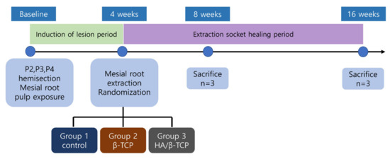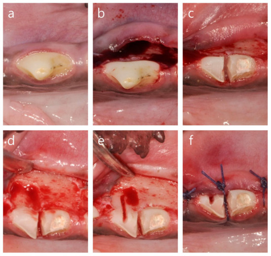 General anesthesia was induced by intravenous injection of Zoletil (250 mg tiletamine hydrochloride in powder and 250 mg zolazepam hydrochloride in powder is mixed with 5 mL of solvent; 0.1 mg/kg; Virbac, Carros, France), xylazine (2.3 mg/kg; Rompun, Bayer Korea, Ansan, Korea), and atropine sulfate (0.05 mg/kg; Jeil, Daegu, Korea). Thereafter, local anesthesia was induced by injecting 1:100,000 epinephrine-containing lidocaine (Huons, Sungnam, Korea). Intracrevicular incisions were made in the mandibular premolar area, and the flaps were elevated (Figure 2a,d). The mandibular second, third and fourth premolars (P2, P3, and P4) were hemi-sectioned by using a diamond burr (Figure 2c). The pulp of the distal root was extracted with a 25 mm K-file (#15 and #20, MANI, Inc., Utsunomiya, Tochigi, Japan), and obturated with a gutta-percha master cone using cold condensation with accessory cones of AH Plus (Dentsply, DeTrey GmbH, Konstanz, Germany). After the root canal treatment, the distal root was sealed with intermediate restorative material (IRM; Dentsply Sirona, Milford, DE, USA; Figure 2c). A dehiscence defect, measuring 3 mm in width and 4 mm in height, was created at the mesial root, and a groove on the buccal area from the top of the teeth to the bottom of the defect was also made, thereby exposing the dental pulp (Figure 2d,e). The surgical site was closed with 4/0 Vicryl (Figure 2f). Suture removal was done 1 week after the surgery.