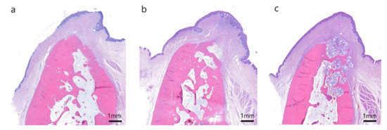Buccolingual section on hematoxylin and eosin staining at 4 weeks after extraction in the (a) control group, (b) T1 group and (c) T2 group.