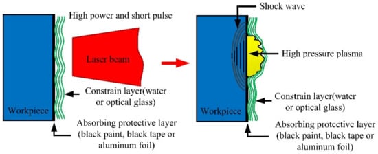 At present, the process structure of the constraint layer and absorbing protective layer is the most typical structure for the LSP treatment [29]. Whether being the constraint layer or the absorbing protective layer, its thickness should be suitable. The thickness of the constraint layer can affect the transmittance of the laser and the pressure of laser-induced shock waves, the lower thickness can increase the transmittance but easily cause the breakdown of the pressure, and the suitable thickness of the constraint layer such as water for most of the LSP process is about 1.2–2 mm [10,30]. The absorbing protective layer can improve the absorption rate of laser energy and increase the peak pressure of laser-induced plasma shock waves as well as protect the materials from thermal melting. The related research shows that there exists a critical thickness of the absorbing protective layer, and that higher thickness can lead to the pressure losses of laser-induced plasma shock waves, but lower thickness can lead to the thermal melting in the near-surface layer of material and the formation of rougher impact pits, and the common thickness of the absorbing protective layer such as black tape is about 100 μm [1,31]. Therefore, in the LSP treatment, the suitable thickness of the constraining layer and absorbing protective layer can improve the transmittance and pressure of the laser-induced plasma, resulting in obtaining a better hardening effect [32].