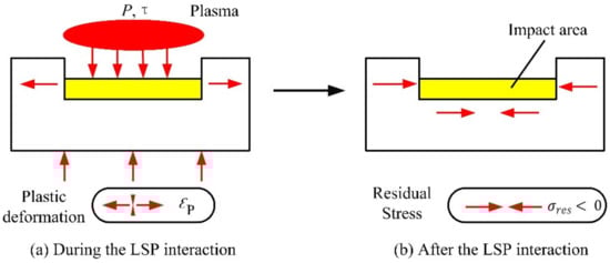 Laser shock processing, also named as laser shock peening, is a novel material surface treatment technology by using the stress effect generated by laser-induced shock waves to improve the material properties, such as anti-fatigue, wear resistance and anti-stress corrosion, etc. [24,25]. The schematic of the principle of LSP is shown in Figure 1 [25]. Before the process of LSP, the LSP surface needs to be coated with an absorbing protective layer such as black tape, black paint or aluminum foil, and then covered with a transparent constraint layer such as water or optical glass, with the main purpose of improving the absorption rate of the laser energy for the metallic materials, and protecting the surface of the metallic materials or alloys from the laser thermal ablation. The laser beam with high power density and short pulse width passes through the transparent constraint layer and acts on the surface of metallic material, the absorbing protective layer that is coated on the surface of metallic material absorbs the laser energy, causing the material temperature to rise. The phenomenon of gasification and ionization will be occurred, and the expanding plasma with high temperature (>104 K) and high pressure (>1GPa) is formed at about the same time. The plasma continues to absorb the laser pulse energy, and due to the restriction of the absorbing protective layer and constraint layer, the plasma expands rapidly and then explodes to form a high-pressure (GPa level) laser-induced plasma shock wave that acts on the surface of metallic material and propagates inside [21,24,25,26]. When the laser-induced plasma shock wave is loaded on the surface of metallic material, uniaxial stress will be generated along the propagating direction of the shock wave, which will lead to plastic deformation in the LSP area. After the laser-induced plasma shock wave is over (about tens of nanoseconds), the plastic deformation region will be limited and restricted by the surrounding material, so a biaxial compressive residual stress field will be generated, which is paralleled to the LSP surface [27,28]. The compressive residual stresses can eliminate the harmful tensile stresses due to the process of material processing such as mechanical machining, heat treatment, welding, laser cutting, plating and hard coating, etc. In addition, the compressive residual stresses can inhibit the initiation and expansion of fatigue cracks. Consequently, after the treatment of LSP, the mechanical properties of the metallic materials or alloys can be improved evidently [28]. The schematic diagram of compressive residual stress induced by LSP is shown in Figure 2 [28].