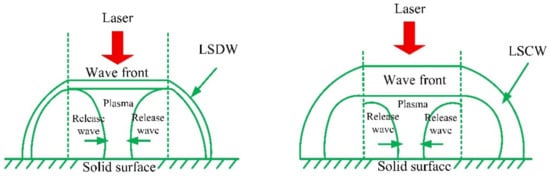 In the irradiation of a strong pulsed laser, which will lead to the partial heating and ionization of metallic materials or alloys, then the further heating and ionization of metallic materials or alloys will occur by means of the transportation mechanism such as heat conduction and thermal radiation. At this time, the laser-supported combustion waves (LSCW) are formed. Subsequently, partial lasers still pass through the plasma volume and act on the surface of metallic materials or alloys, the radiation of plasma that is near the LSP region will be helpful to enhance the thermal coupling of laser and metallic target, that will lead to the formation of laser-supported detonation waves (LSDW), which can absorb the laser pulse energy completely [10,34,35,36,37]. The structure diagram of LSCW and LSDW is shown in Figure 3 [1].