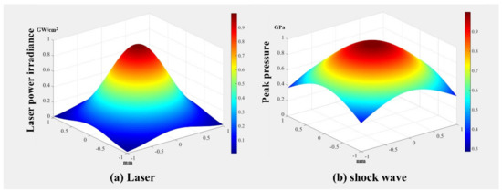 According to the Equation (13), we can obtain the spatial distributions of laser power irradiance and peak pressure of the shock wave (as shown in Figure 4) [1]. Compared with the spatial distribution of laser power irradiance, the distribution of peak pressure of the laser-induced plasma shock wave is more uniform in two-dimensional space due to the increase of its 1/e2 radius [42].