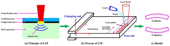 Laser shock forming (LSF) is a complex dynamic forming process, which is developed from LSP. As a purely mechanical forming method, LSF is utilized to modify the curvature of metal sheet by thermal stress that induced by the irradiation of laser beam [44]. The schematic of the LSF process is shown in Figure 5. The surface of metal sheet needs to be coated with an absorption protection layer firstly, and then covered by the flowing water as the constraint layer. So, a typical structure of absorption protection layer and constraint layer is formed, which is the same as for the LSP. The pulsed laser with high-intensity passes through the constraint layer and ablates the absorbent layer and scans along a designed path. The generated laser-induced plasma shock wave applied to the metal sheet, which will lead to local plastic deformation and material expansion in the shocked area, causes the plastic bending of the metal sheet. A number of incremental deformations induced by LSP applied successively to the metal sheet are accumulated to obtain greater convex or concave bending deformation, which is depending on the process parameters such as the laser pulse energy and the thickness of metal sheet [45,46]. It should be noted that during LSF, the bottom is not restricted, just one end needs to be clamped, which is different from the LSP. In order to ensure the quality of LSF, the pulsed laser beam needs to be perpendicular to the surface of the metal plate during LSF, so the serpentine shocked path and the scanning direction from free end to clamping end are selected generally (as shown in Figure 5b).