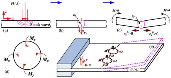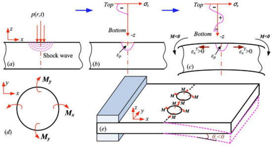 Studies about LPF can be traced back to 2002; the three-dimensional bending principle and precise forming method of the metal plate by using the LSP system was first proposed by the Lawrence Livermore National Laboratory (USA) [47]. With the deepening research on LSF, the bending deformation for different materials are discussed and the corresponding deformation mechanisms are proposed. In 2010, the stress gradient mechanism (SGM) and shock bending mechanism (SBM) of LSF (as shown in Figure 6 and Figure 7, respectively) were proposed by Hu et al. [46]. When the metal sheet is thick or the laser power irradiance is low, the laser-induced plasma shock wave cannot penetrate the metal sheet, and this situation is the SGM, which makes the LSP region compressed at the thickness direction and puts the material beneath the top surface into the tensional state at the length direction, and causes a negative bending moment M that drives the metal sheet downward. As a result, the downward bending of the convex is generated at the free end of the metal sheet [46,47]. When the metal sheet is thin enough or the laser power irradiance is high enough, the laser-induced plasma shock wave can penetrate the metal sheet without significant attenuation, and this situation is the SBM, which makes the LSP region plastically deformed completely due to the pressure of laser-induced plasma shock wave being very high, and it can be considered that there is almost no steep stress gradient through the thickness of the metal sheet. So, the downward movement will exist through the thickness at the LSP region of metal sheet and cause a positive bending moment M that drives the metal sheet upward. As a result, the upward bending of concave is generated at the free end of metal sheet [46,47].