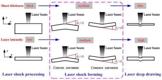 According to the mechanism of LSF, we can know that, if the metal sheet is thick enough or the laser power irradiance is low enough, the metal sheet is hardly bent, so the compressive residual stress will be formed in the near-surface of metal sheet, which is the same as LSP. In contrast, if the metal sheet is thin enough or the laser power irradiance is high enough, it will be transformed into laser deep drawing (as shown in Figure 8) [46]. So, it can realize the bending deformation from one direction to another direction smoothly by setting different process parameters. LSF is a novel forming technology, through the laser-induced high dynamic loading which can modify the curvature of metal sheet with the advantages of being tool-free, having high efficiency and with non-contact, [48,49] etc. At the same time, as a pure cold-work process, LSF can generate compressive residual stress over both side of metals, which can resist cracks from corrosion and fatigue for formed parts.