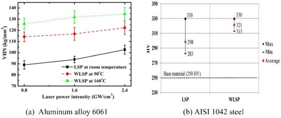 The enhanced mechanical properties such as the hardness, residual stress and the stability of compressive residual stress are the key beneficial surface properties induced by the treatment of WLSP [50] according to the WLSP experiments of aluminum alloy 6061 by Liao [60] and AISI 1042 steel by Tani [61] (as shown in Figure 10a,b, respectively). From the Figure 10, we can know that with the treatment of LSP and WLSP, the surface hardness of the samples are enhanced. However, compared with the samples treated by LSP, the samples treated by WLSP own a higher surface hardness. For instance, with the laser parameters of 1.6 GW/cm2 for the laser power irradiance, 5 ns for the laser pulse width and 2 mm for the diameter of laser spot (the main experiment parameters are listed in Table 1, the same below), the surface hardness of aluminum alloy 6061 treated by WLSP at the temperature of 160 °C (132VHN) is about 44% higher than that treated by LSP (94VHN). In addition, the surface hardness of aluminum alloy 6061 shocked by WLSP at the temperature of 160 °C is higher than that shocked by WLSP at the temperature of 90 °C. With the laser parameters of 1.5 GW/cm2 for the laser power irradiance, 8 ns for the laser pulse width and 4 mm for the diameter of the laser spot, the surface hardness of AISI 1042 steel shocked by WLSP at the temperature of 500K (321HV) is about 8% higher than that shocked by LSP (298HV). The enhanced surface hardness is attributed to the strain hardening effect by the severe plastic deformation of near surface material and the precipitation hardening effect by the generation of high density nano-precipitates [50].