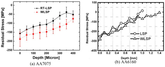 The enhanced residual stress by WLSP: (a) AA7075, (b) AA6160 [62,63].
