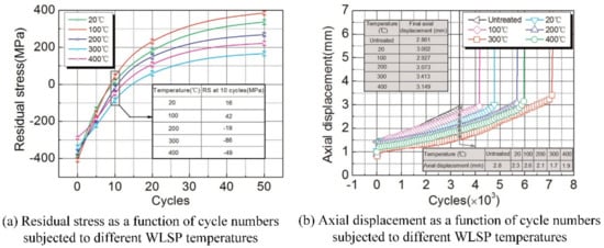 Similar to the surface hardness, the residual stress of samples treated by WLSP are higher than that treated by LSP, according to the studies of Ye (as shown in Figure 11 for detail) [62,63]. From the Figure 11, we can know that for AA7075 or AA6160, the surface compressive residual stress and the residual stress layer depth of samples treated by WLSP are higher than that treated by LSP. Besides the residual stress, the stability of compressive residual stress is also improved, which is of great significance for the extended fatigue life of materials. Figure 12 shows the effects of WLSP on the low-cycle fatigue behavior of Ti6Al4V alloy [64]. As observed in the Figure 12, the samples treated by WLSP show a higher stability of residual stress and the axial displacement than that treated by LSP. However, it doesn’t mean that the higher the temperature of WLSP, the better the stability of residual stress and the axial displacement. For instance, the residual stress relaxation in the first 10 cycles (as shown in Figure 12a), and the residual stress at 10 cycles of samples treated by LSP or WLSP at the temperatures of 20, 100, 200, 300 and 400 °C are 16, 42, −19, −86 and −49 MPa, respectively. This similar phenomenon can be also found by the studies of Ye [62] and Huang [65]. So, there exist the most suitable WLSP temperatures to obtain the best stability of residual stress and the highest compressive residual stress. According to the DSA theory proposed by Qian (“Qian-Xiao-Li model”) [66], the suitable WLSP temperature should be 0.2–0.5 Tm (Tm is the melting temperature of metallic material or alloy). In addition, according to the research of Meng [67], the optimum pressure of laser-induced plasma shock wave for WLSP treatment is 2 times of HEL, which is different from the best pressure of laser-induced plasma shock wave for LSP treatment with 2.5 times of HEL.