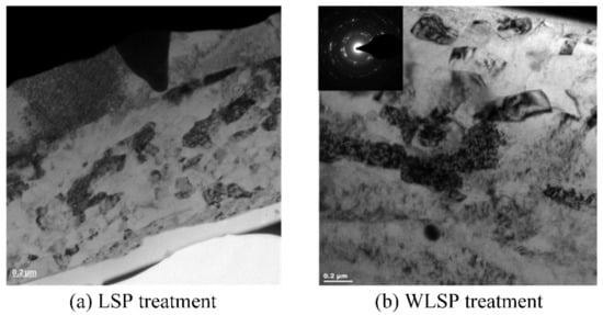 The principle of LSP and WLSP tell us that the enhanced mechanical performance of the material is very closely related to the micro-structure. The transmission electron microscope (TEM) is usually used to investigate the micro-structures evolution. The TEM image for grain structure of AA6061-T6 near the top surface after LSP and WLSP is shown in Figure 13 [63]. Compared with LSP sample, the nanoscale precipitates appeared in the WLSP sample, which can be blamed by the effect of DSA. At the same time, there are no second phase particles that can be found in the LSP sample [50,63]. During WLSP, the effect of DSA can serve the thermal energy to promote the forming of nanoscale precipitates with the stress effect of the ultra-high strain rate that is generated by the laser-induced plasma shock waves, which can supply numerous nucleation situations for the precipitation [63]. Then these nucleated nanoscale precipitates will be interacted with dislocations, which will lead to the high-density dislocation arrangement and the nanoprecipitates. However, LSP does not have the effect of DSA, so the lower density precipitates occur in LSP treated samples, and the high density nano-precipitates occur in the WLSP treated samples, and the high density nano-precipitates can facilitate the pinning of dislocations. So, the WLSP-treated samples will have a greater stability of dislocation structure. The increase of surface hardness, compressive residual stress, depth of residual stress layer and the stability of dislocation structure, which will inhibit the generation and propagation of cracks, results in the improved the stability of residual stress [68]. Compared with the LSP-treated samples, the compressive residual stress lever of the WLSP-treated sample is higher than that, and the effect of DA and DSA can provide the key contribution to the improvement [63,69]. In conclusion, the material strength and stability of residual stress by WLSP treatment are higher than that by LSP treatment.