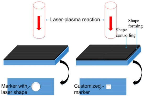 The schematic diagram of LSM is shown in the Figure 14 [72]. Prior to the LSM, the marking surface of the material needed to be coated with an absorbing protective layer (such as black tape), and the thickness should be no less than the critical thickness of the LSP, as we know, with the stress effect generated by laser-induced plasma shock wave, which will lead to concave morphology on the surface of the material. The shape of the concave morphology is the same as the laser spot and its size is slightly larger than the diameter of the laser spot. In order to obtain the desired marking shape, before the LSP treatment, a second absorbing protective layer with a square hole is devised and applied on the first absorbing protective layer. It should be noted that the size of square hole needs to be smaller than the laser spot in size, and the laser beam needs to be aligned with the square hole area [72]. As a result, a square concave morphology that corresponds to the designed square hole can be obtained. According to the main functions of the absorbing protective layer, the first absorbing protective layer is named as the “shape forming layer”, and the second absorbing protective layer that reduces the pressure of the laser-induced plasma shock wave, is named as the “shape controlling layer”. As shown in the Figure 14, the thickness of the second absorbing protective layer is thicker than that of first absorbing protective layer. So, the pressure induced by the laser plasma shock wave inside the square hole is higher than outside the square hole, and the concave morphology inside the square hole is also higher than outside the square hole. Based on the principle, a series of concave morphology induced by LSP successively to the marking surface of metallic materials or alloys can be accumulated to obtain the designed marking shape by means of the multi-spot LSP treatment.