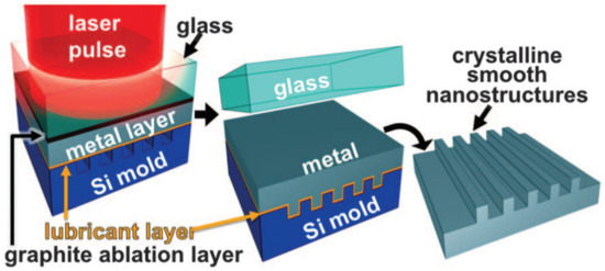 The schematic illustration of LSI is shown in Figure 16 [74]. The Nd:YAG laser pulse with the laser power irradiance of 0.3–1.4 GW/cm2, wavelength of 1064 nm and laser pulse duration of 5 ns passes through the glass and irradiates the sample surface that is coated with graphite ablation layer (thickness of 10 mm). The interaction between the laser pulse and the graphite ablation layer will lead to plasma with high temperatures and high pressure. Due to the restriction of the confining media (glass), the plasma expands rapidly and then explodes, generating a strong laser-induced plasma shock wave. With the stress effect generated by laser-induced plasma shock wave, the metallic sheet is compressed into the underlying nanomold (Si mold) and attached to the substrate surface firmly [22,74,76].