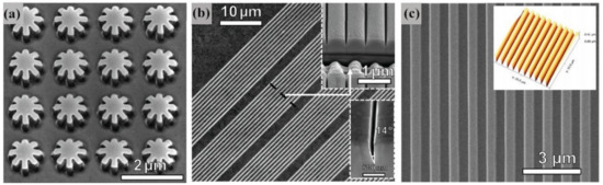 The SEM images of several complex 3D nanostructures manufactured with LSI. (a) Array of nanogears imprinted on cold-rolled aluminum foil; (b) array of triangular V-grooves; (c) array of the ultrasmooth nanotrenches fabricated on the Ti surface layer with the thickness of 2.5 mm. [74].
